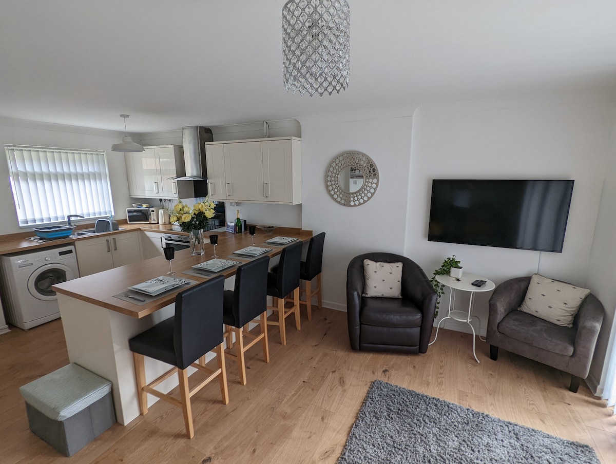 Apartamento luminoso y espacioso de 2 dormitorios en Warrington, con una ubicación ideal con acceso rápido a la M62 y M6 y conexiones fáciles a Liverpool y Manchester. El departamento cuenta con un moderno baño con ducha a ras del suelo, jardín privado, cómodo espacio habitable y cocina totalmente equipada. Capacidad para 6 personas con un sofá cama. Hay un parque enfrente de la calle y se admiten mascotas, por lo que es ideal para familias, viajeros de negocios y estancias más largas.