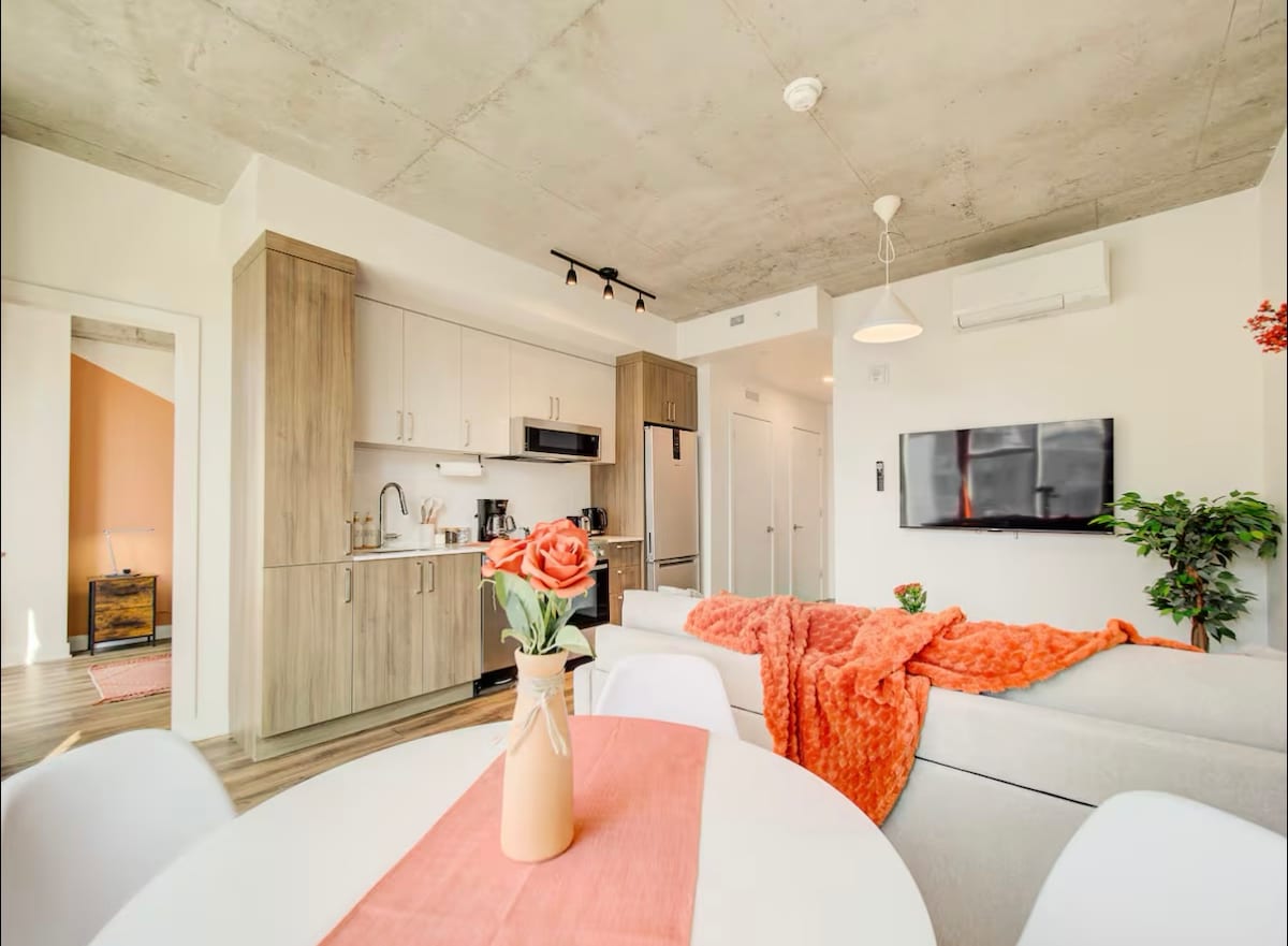 This bright, modern, fully equipped apartment offers sweeping panoramic views of Montreal, with breathtaking sunsets illuminating the skyline. Designed with warm terracotta tones inspired by earthy autumn hues, the space feels cozy, grounded, and inviting—ideal for unwinding after a full day in the city.