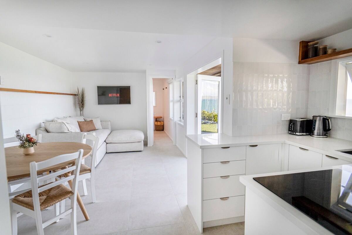 Absolute waterfront accommodation right on the surf, is the modern Whale Bay Surf Bach Stylish 2bedroom ocean front, ground floor apartment nestled in a private, sub-tropical garden with the famous left hand point break out front & private access to the surf & boardwalk Soak in the surf & magical sunsets from the spa & enjoy watching the waves roll in from the bedroom, living or large deck & grass area - you'll be in absolute awe of the incredible views & entertained by our unique surroundings