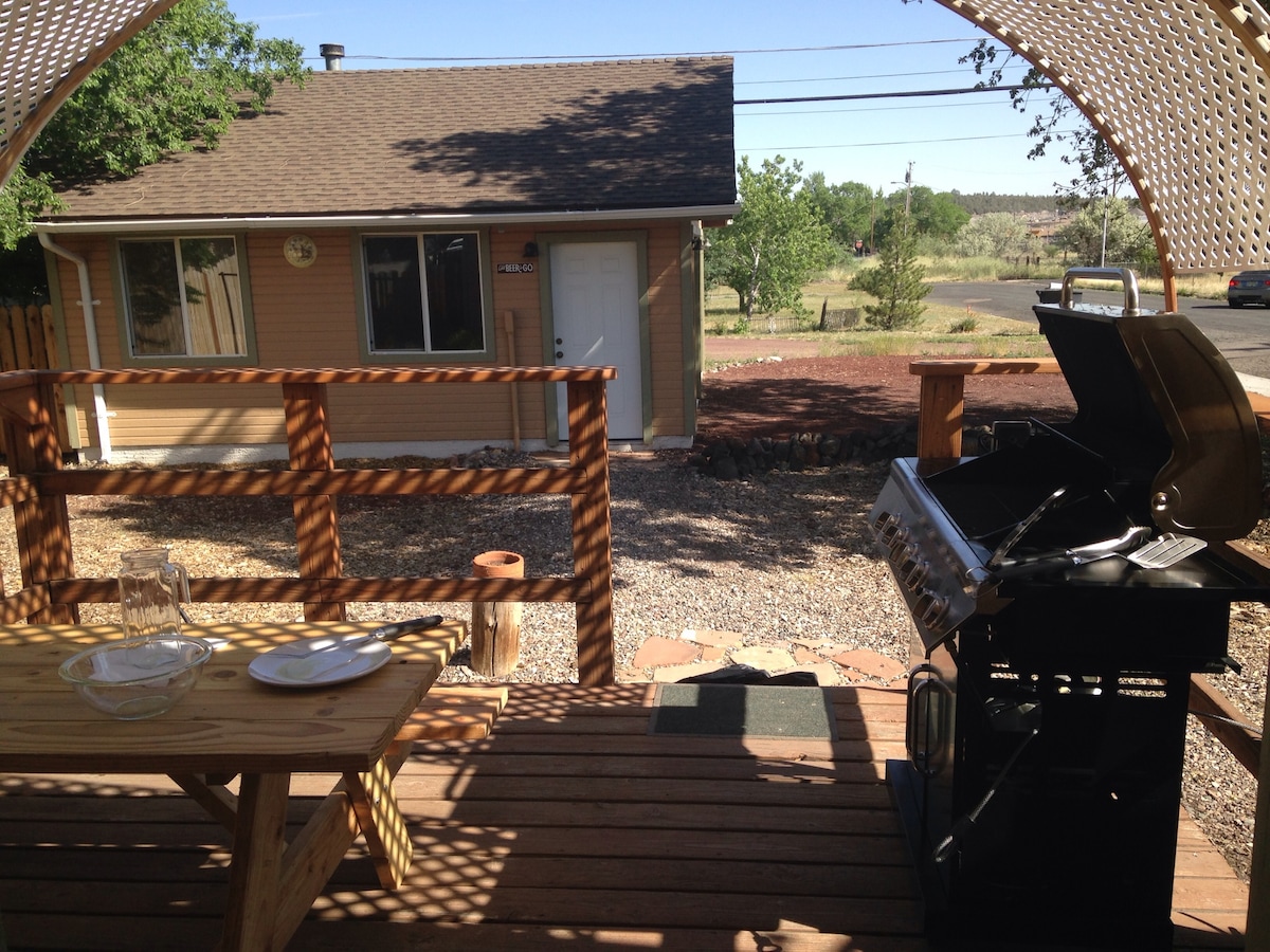 ¡Casa acogedora y limpia! Interior encantador en una ubicación perfecta. Camina hasta el centro de la ciudad por la Ruta 66. Chimenea, televisor de 55”, cómoda cama queen en el dormitorio privado y sofá cama queen en la sala de estar. Parrilla, mesa de patio, cocina completa, cafetera Keurig y café de filtro con café, algunas especias, estufa con superficie de vidrio, hermosos pisos de madera noble, amplia terraza envolvente con dos mecedoras, juegos de cartas y de mesa, lavadora/secadora. Cerca de todo. A 1 minuto de la tienda de comestibles y de la Ruta 66, a 2 minutos del tren, a 6 minutos de Bearizona y a 1 hora del Gran Cañón.