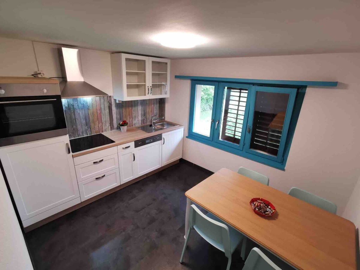 Selbstversorger Wohnung mit Parkplatz, Kuchenbereich mit Herd, Spulmaschine, Nespresso, etc., Esstisch, bequems Sofa, WiFi y garten-blick. Offene treppe bis zum grossen Schlafzimmer und Badezimmer mit Badewanne und Dusche. Apartamento independiente con estacionamiento; pasillo, cocina pequeña (horno, lavavajillas, nespresso, etc.), mesa de comedor, sofá cómodo, WiFi y vista al jardín. Escalera abierta hasta un gran dormitorio doble con almacenamiento y baño con bañera y ducha.