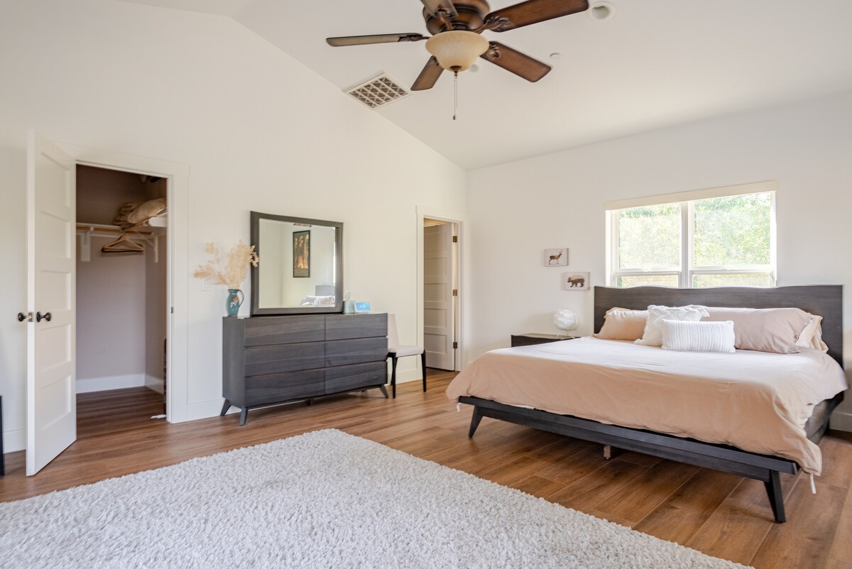 ¡Bienvenido a Villa María! Este dormitorio muy grande y moderno con baño y un gran patio contiguo está a solo 30 minutos del parque nacional Kings Canyon. El patio incluye una hermosa zona de barbacoa al aire libre con fregadero, nevera, ahumador y persianas eléctricas en el techo. Disfruta de una privacidad perfecta, ya que el resto de la casa no estará en uso mientras estés allí. Después de un gran día en el parque, puedes encender la barbacoa, coger una cerveza fría de la nevera y relajarte bajo el árbol en el patio mientras el sol se pone en Bear Mountain. ¡Un paraíso!