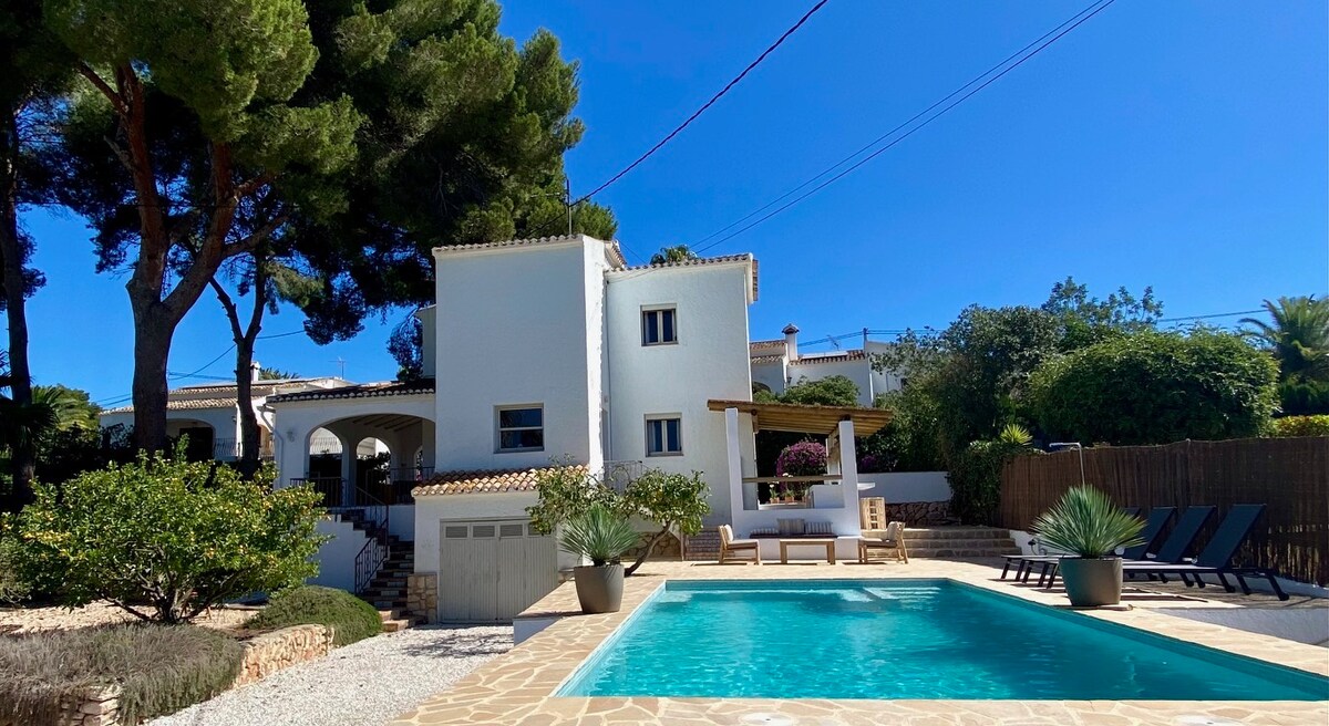 Maravillosa villa de estilo mediterráneo con cuatro dormitorios dobles, amplia piscina privada, jardín y grandes espacios al aire libre. Situada a 2km de la playa (6 min en coche) y a 1km del centro histórico de Jávea. La casa cuenta con 3 cuartos de baño, un porche acristalado, un amplio salón-comedor con sofá cama y 2 cocinas, una de ellas exterior ubicada en otro porche abierto que cuenta con barbacoa y una gran mesa para comidas al aire libre. 📞 Seis-Uno-Nueve-Ocho-Cinco-Tres-Dos-Cero-Uno