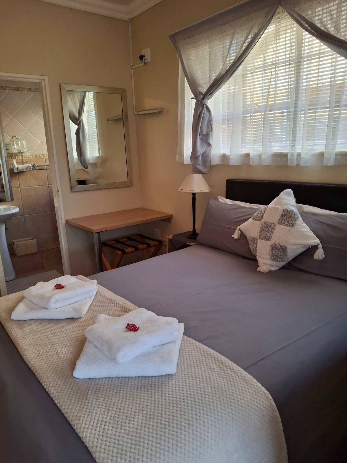 Cambia el ajetreo de la ciudad por el ritmo lento de la vida en la granja a las afueras de Bloemfontein. Escondido en una granja tranquila y segura, este encantador escape te invita a despertarte con el canto de los gallos, la charla de las gallinas de Guinea y el aroma terroso de las ovejas que se lleva la brisa fresca de la mañana. Termina tus días con puestas de sol doradas, contempla estrellas brillantes y, si eres un madrugador, disfruta de un amanecer impresionante antes de volver a instalarte en tu acogedora cama.