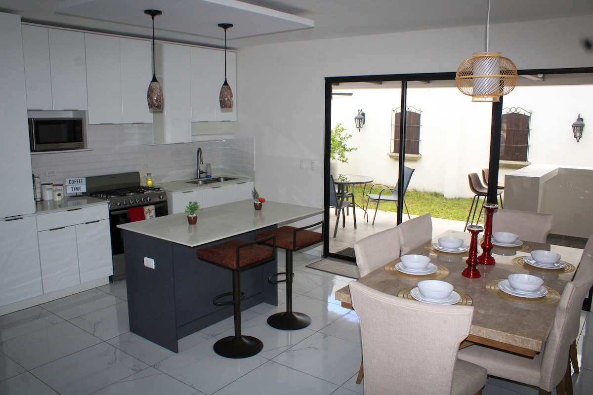 Casa por estrenar, recién amueblada, ideal para familias: 3 habitaciones, 5 camas, A/C en toda la casa, cocina equipada, 2 baños, terraza amueblada, lavadora/secadora y cochera para 2 autos. Ubicada en residencial privado con piscina, amplios jardines, cancha de fútbol y básquet, sendero para caminar y seguridad 24/7. Espacio cómodo, limpio y cercano a supermercados y restaurantes.