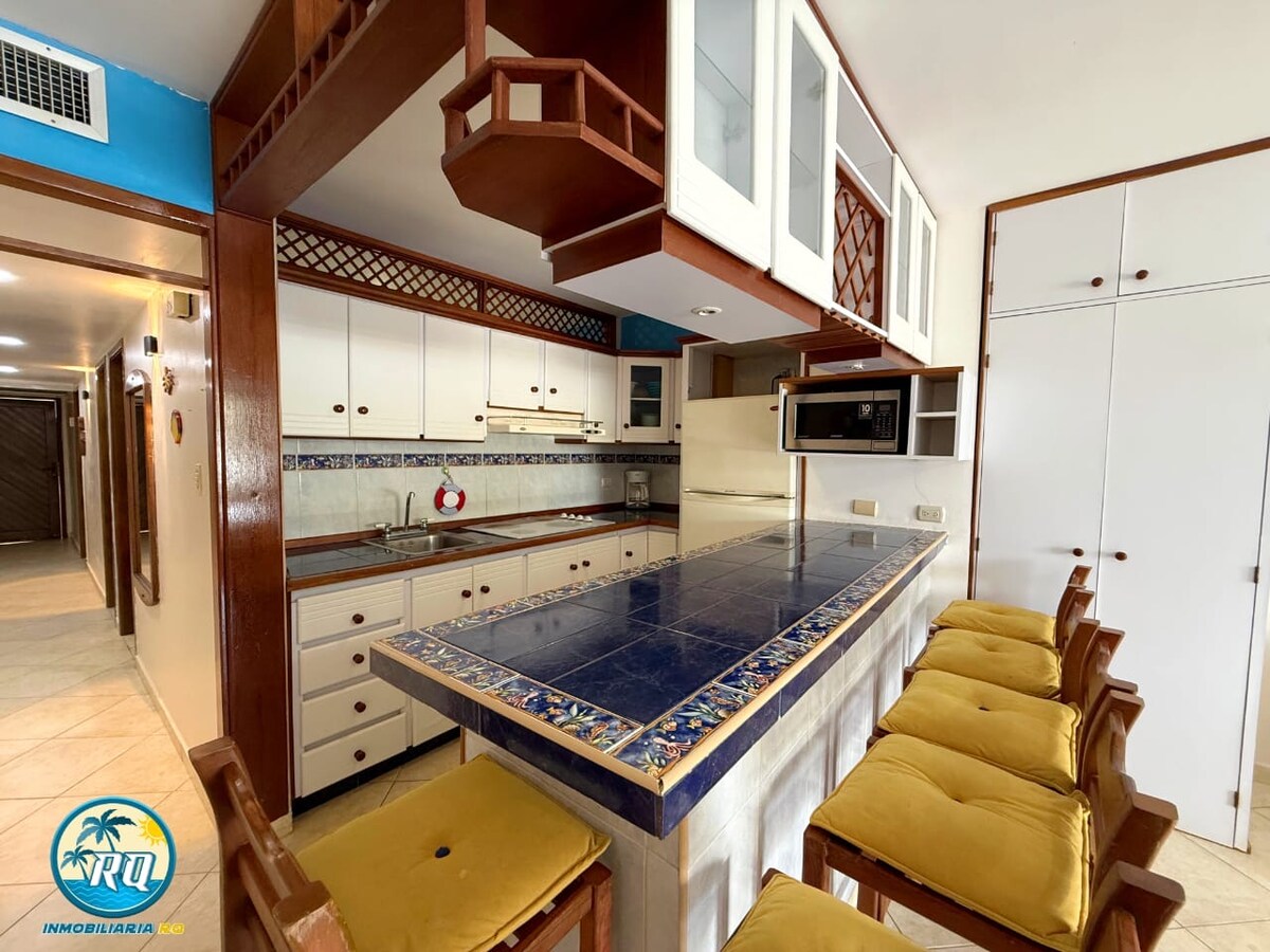 Hermoso apartamento frente a la playa con acceso a la misma, ideal para disfrutar con la familia y amigos. A 15min en carro del centro donde se encuentra el area comercial y los muelles a los cayos. Totalmente equipado , cuenta con piscina, jacuzzi ( no tiene precio adicional ) wifi, aire acondicionado , planta electrica para areas comunes, pozo de agua, estacionamiento privado y vigilancia las 24h del dia.