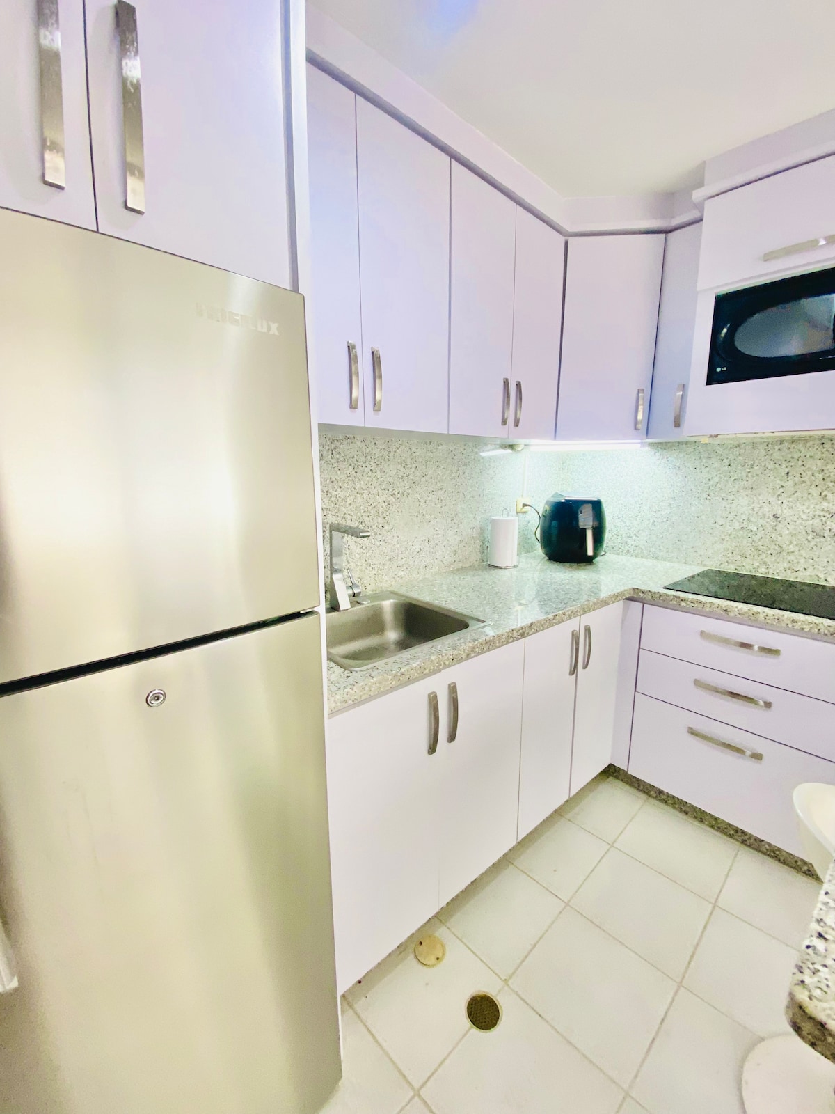 Apartamento con hermosa vista al mar en Bahia Kangrejo, diagonal hotel Hesperia! 1 habitacion con cama matrimonial. 2 sofa-cama en la sala,2 baños con pareduche de vidrio templado y agua caliente. Cocina electrica con utensilios básicos. Wi-Fi fibra de alta velocidad, 2 televisores con Netflix, 2 aire acondicionados tipo slpit. El edificio cuenta con cerco electrico,piscina para niños y adultos. Acceso a la playa, parrilleras, camineras. 1 puestos de estacionamiento, conjunto cerrado.