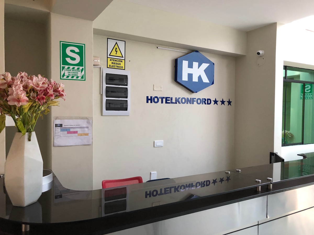 HOTEL KONFORD Confortable, calidad de atención, cuartos MATRIMONIALES, DOBLE Y TRIPLE, camas de 02 plazas, agua caliente, WIFI, ubicación en el centro de la ciudad a 1 cuadra de la plaza de armas, ideal para turistas, familias, negocios, trabajo.