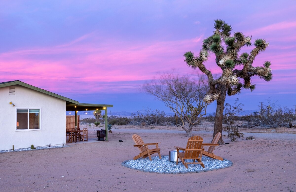 White Desert House: Luxe hideaway in a magical spot on 2.5 acres with privacy, quiet, and stunning vistas, but still just 15 minutes to Joshua Tree and 5 minutes to downtown Yucca Valley. Bordering the exclusive Rock Reach neighborhood, the house is perfect for a relaxing getaway while being central to conveniences. Outside, enjoy the fire pit and a hot tub under the stars among Joshua Trees and cacti. Inside, designer furnishings and comfortable beds await. IG: @white_desert_house