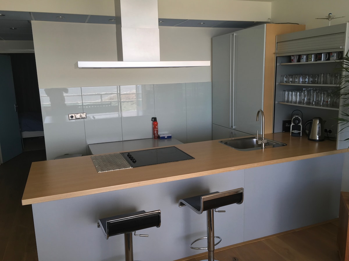 El estudio SUN se encuentra directamente en el mar y las dunas. Puedes disfrutar del amanecer sobre las dunas y del atardecer en el mar desde tu estudio. Zona de estar: vistas al mar y a la zona de kitesurf. Cama doble (160x200): vista a las dunas. Cocina americana: microondas, hervidor, cafetera, lavavajillas y refrigerador (sin estufa/sartenes). Baño: bañera y ducha de efecto lluvia. Inodoro separado. Balcón. Entrada propia. Camas hechas, toallas, WIFI, Netflix incluido. No se admiten mascotas. Estacionamiento gratuito.