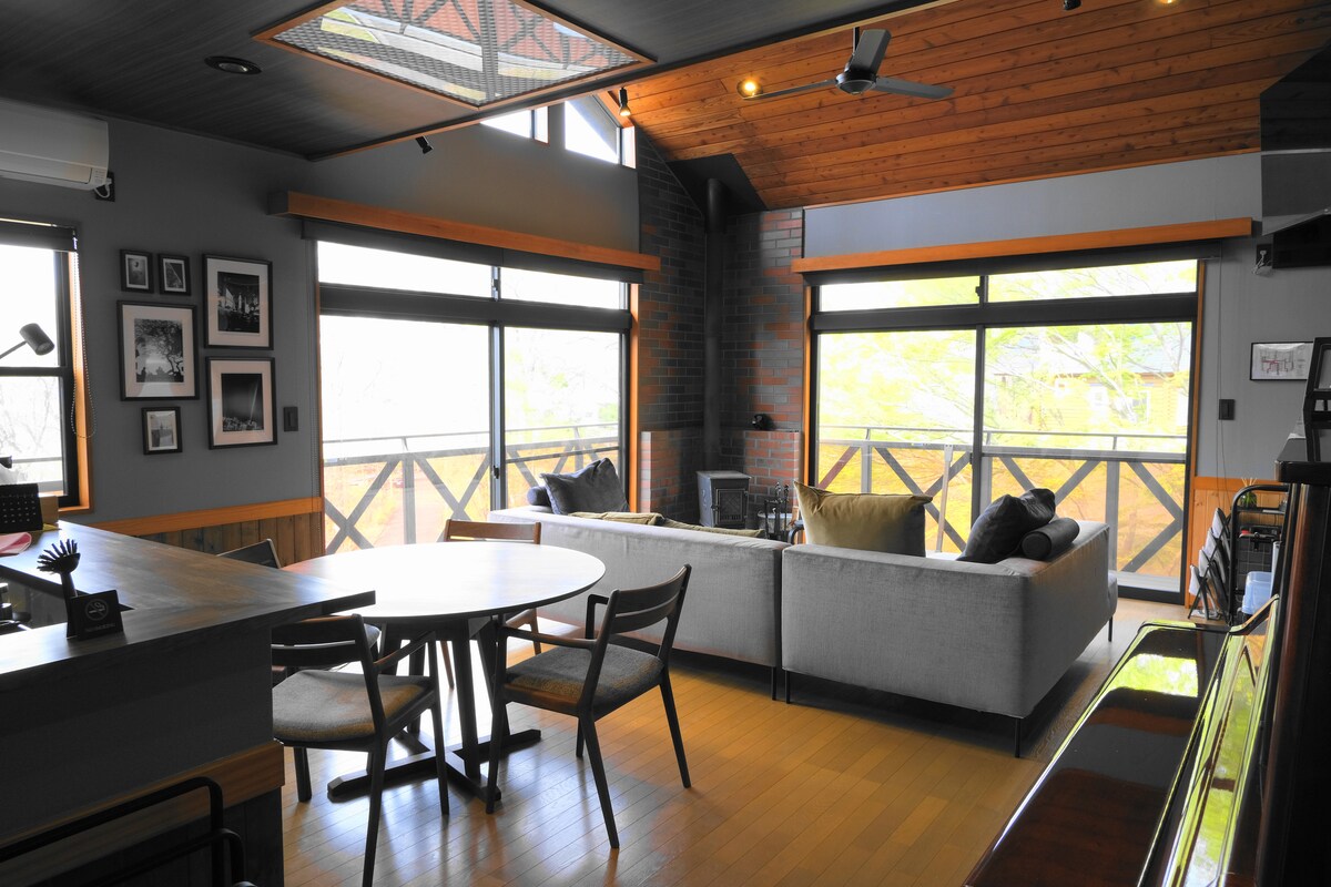 Esta es una casa de campo nueva construida en 2022. Al entrar en la elegante casa con paredes exteriores negras, el pasillo de piedra que conduce a la sala de estar del techo alto te hará olvidar tu vida cotidiana. El baño al aire libre está rodeado de árboles y, en invierno, puedes disfrutar de un relajante baño con vistas a la nieve. Disfruta de un teatro privado en la sala de estar y el dormitorio con una pantalla de proyector de 100 pulgadas. Las pantallas y los escritorios también están disponibles para tu espacio de trabajo.