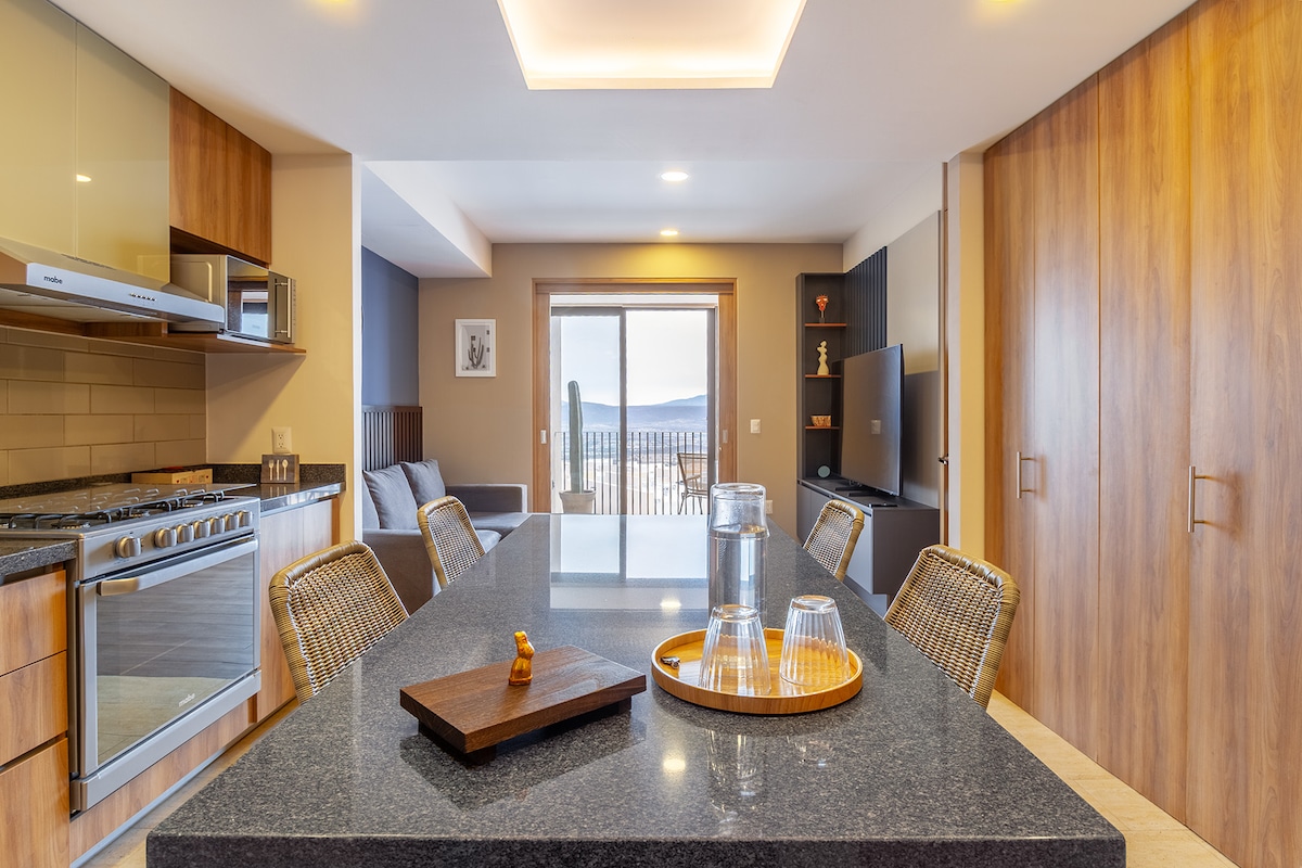 ¡Descubre las vistas más impresionantes de Querétaro! desde este moderno departamento de estilo industrial. A solo 10 minutos del centro, disfruta de increíbles panorámicas tanto de la ciudad como de la montaña. Perfecto para grupos de hasta 3 personas, ofrece un espacio acogedor y funcional que combina confort y estilo. Es ideal para viajes de trabajo o placer por el fácil acceso, comercios y la posibilidad de facturar tu estancia. Experimenta la comodidad que este departamento te ofrece.