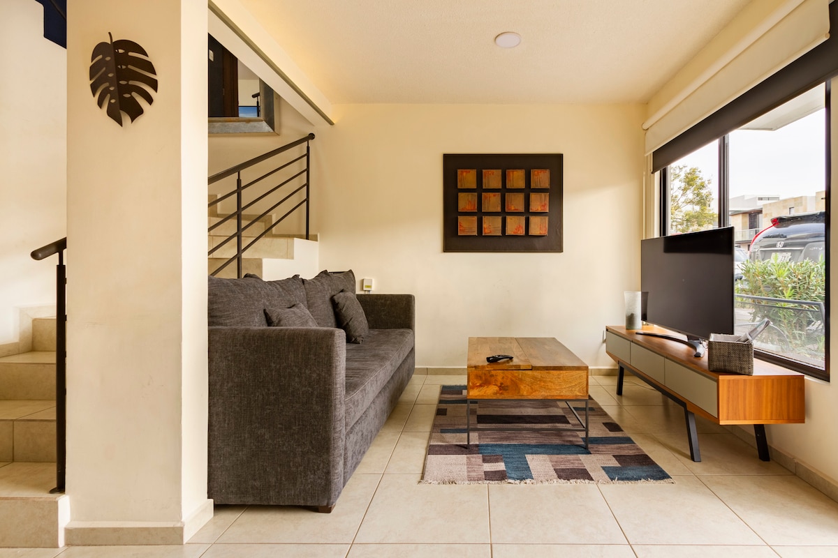 💵 Facturación Disponible 💵 🌿Refugio con estilo en Querétaro🌿 🛏️ 2 Recámaras | 2 Baños. ⭐Recámara principal Cama King baño privado. ✨Segunda recámara: Cama Queen 👶 Cuna disponible bajo solicitud Espacios Comunes 🎥 Sala de TV: Pantalla de 65" con acceso a streaming. 🍳 Cocina: Totalmente equipada para tu comodidad 🌿 Patio trasero: Tranquilo y acogedor, ideal para relajarse Amenidades 🏊 Alberca 💪 Gimnasio 🏀 Cancha de baloncesto 🎡 Área de juegos para niños ✨ Cosmos Homes Quality.