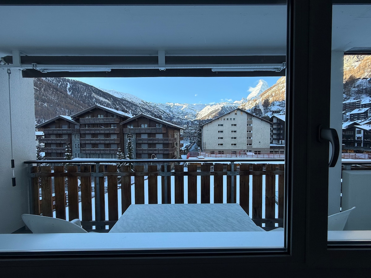 Apartamento comfortable cerca del centro y del aceso a las telecabinas con vista extraordinaria sobre el MATTERHORN (Cervino). Se le puede admirar sin obstruccion desde el dormitorio (inclusive acostado en la cama!), desde el salon y por supuesto desde el largo balcon sobre el cual dan el dormitorio y el salon. Equipado con todas las comodidades modernas incluyendo : wifi privado gratis, 2 grandes pantallas de TV (40''), Bose dock, etc...