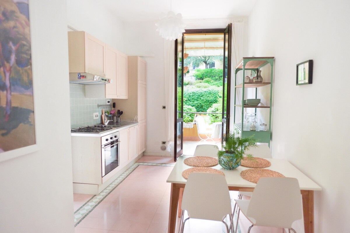 El apartamento está situado en el último piso de un antiguo edificio equipado con un ascensor acristalado en el corazón de la medieval Bolonia, justo enfrente del Teatro de la Ópera del siglo XVII. Acogedora, panorámica y soleada, una tranquila logia privada se abre a los patios interiores que ofrecen excelentes vistas sobre los tejados, los pinos seculares y las dos torres medievales.