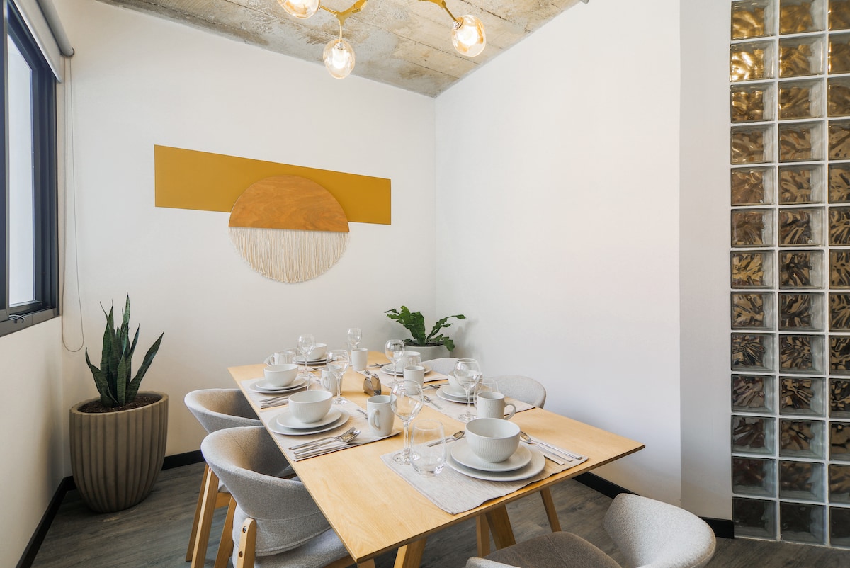 moderno, minimalista, práctico ubicado cerca de los mejores centros comerciales (8 minutos caminando) y a 15 minutos del aeropuerto internacional. Cocina completamente equipada, wifi, TV, spotify, netflix Amplio espacio al aire libre lleno de árboles y plantas decorativas incluyendo colección de bonsai. También tiene un pequeño gimnasio con equipo básico