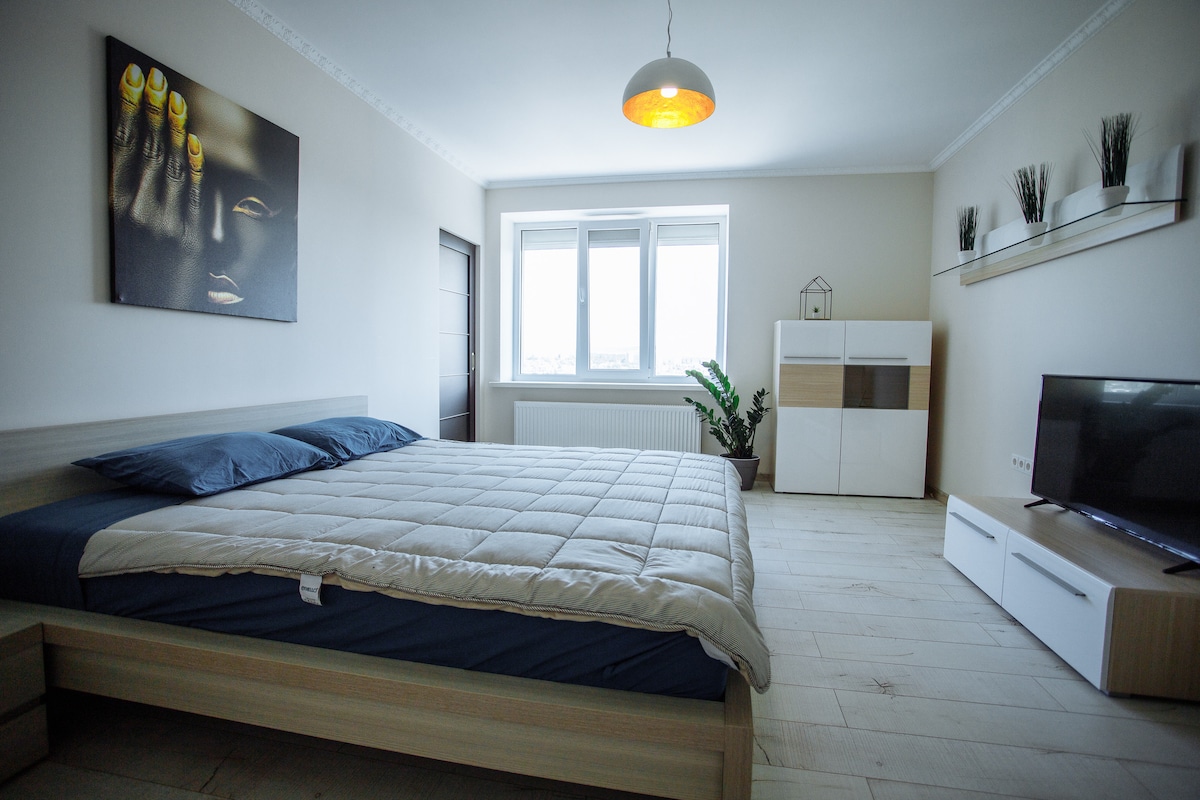 Ideal para familias, espacioso, moderno con ventanas panorámicas en un nuevo bloque, cerca del centro de la ciudad, (10 minutos en taxi 5 €) desde el aeropuerto. Estacionamiento subterráneo -14 € Excelente ubicación, acceso rápido al transporte público, a 200 m del jardín botánico, supermercado, farmacia, restaurantes, bancos ,zoológico. Ofrece todo lo necesario para una estancia agradable, cocina totalmente equipada, 2 televisores inteligentes con Netflix, wifi. Disfrutá de lo mejor de Chisinau desde este lugar privilegiado