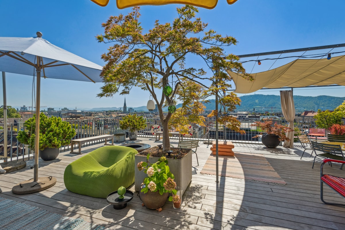 Bienvenido a tu acogedor refugio en la azotea en el corazón de Zúrich. Este estudio en el último piso, lleno de sol, cuenta con una terraza privada en la azotea. El espacio está lleno de luz natural todo el día y es perfecto para parejas o familias pequeñas. Disfruta de una cocina totalmente equipada, una cómoda cama, comedor/área de trabajo y WiFi rápido. El lago y los excelentes restaurantes están a pocos pasos :)